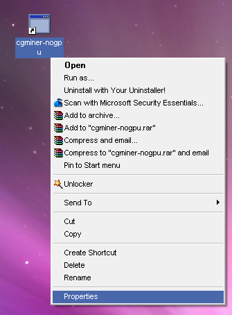 7. Silahkan Jalankan cgminer-nogpu.exe, dan hasilnya seperti dibawah ini :5. Kemudian klik Kanan Properties shourtcut yg di buat tadi sseperti di bawah ini :